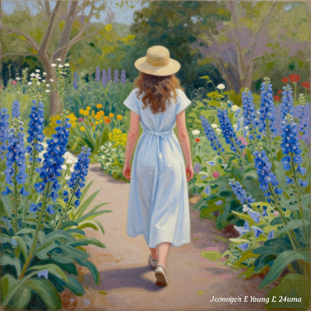Woman strolling through a vibrant garden pathway flanked by tall blue delphiniums, captured in an oil painting titled \"Delphinium Walk\" by Jennifer E Young, measuring 24x20 inches on linen.