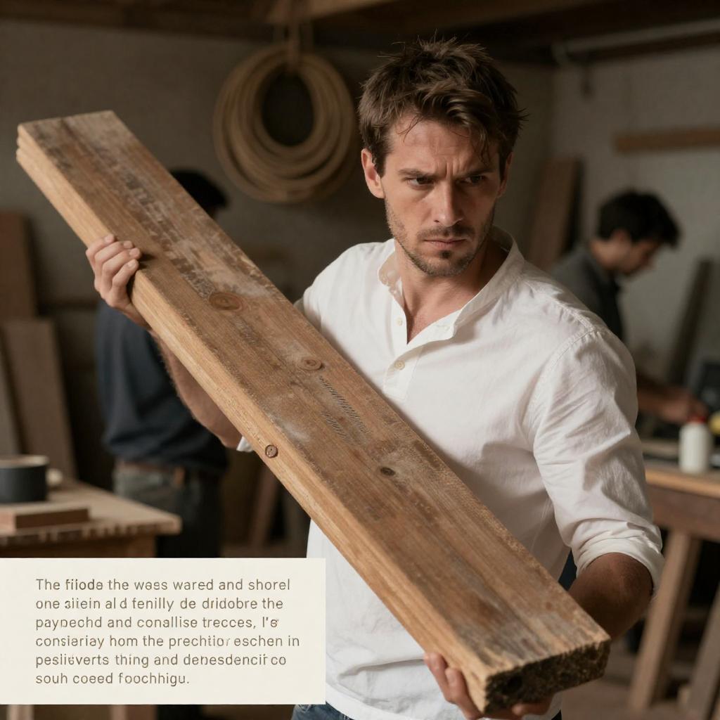 Photograph of a man with short brown hair, white shirt, intense expression, holding a large, weathered wooden plank in a dimly lit, cluttered workshop. Coiled rope in background. Text block in bottom left corner. Two people.