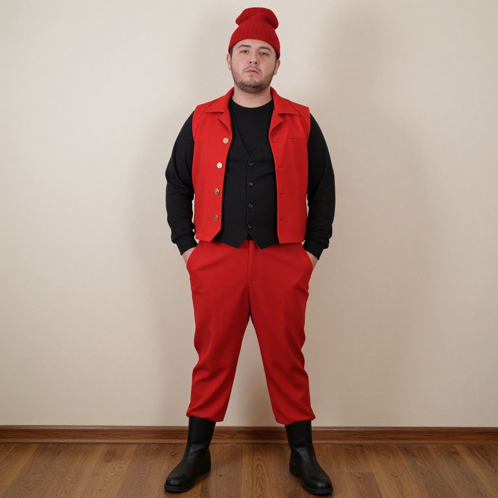 Costume chubby male, 1boy, solo, male focus, hands in pockets, standing, red pants, full body, pants, looking at viewer, hat, boots, long sleeves, indoors, vest, red vest, jacket, closed mouth, facial hair