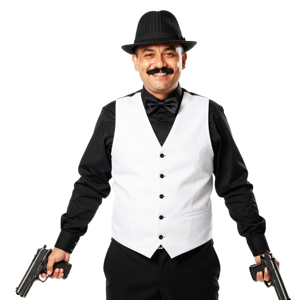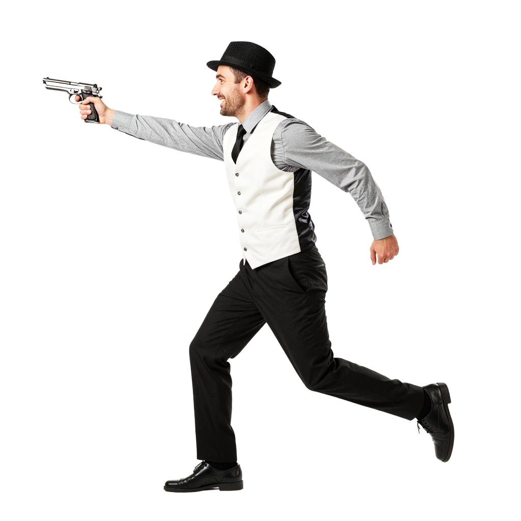 Photograph of a man in a black suit, black shoes, and black fedora, standing in a dynamic pose and aiming a silver handgun with his right hand. He's positioned to the right, with his left arm slightly bent and his legs apart. The background is completely white, making the figure stand out sharply. The image has a bold, action-hero vibe.