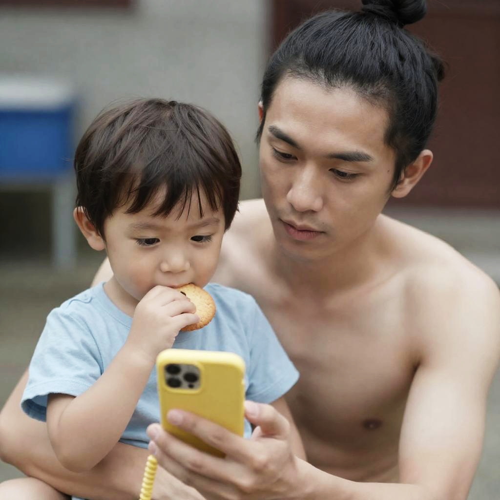 Photograph of a man carrying a screaming child on his back. Man wears gray t-shirt, cross necklace. Child wears white sweater. Man's face contorted in pain, eyes closed. Child's mouth wide open, eyes squeezed shut. Dimly lit room, patterned wallpaper, painting on wall. Man's head tilted back, child's arms wrapped around neck.