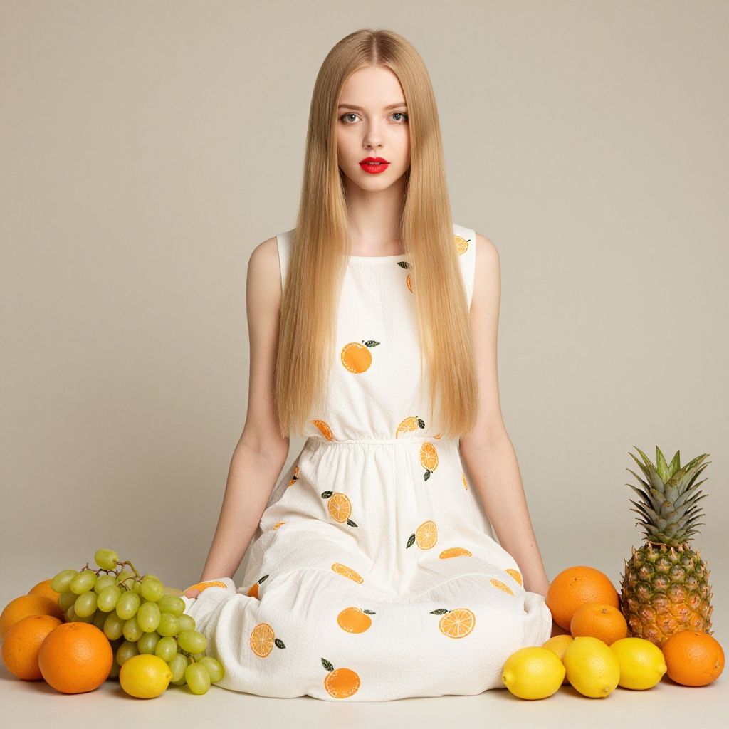 Portrait of a young blonde woman wearing a white dress with orange fruit prints. She has long straight hair and red lipstick. The woman is surrounded by various fresh fruits including grapes, oranges, lemons, and a pineapple on a neutral background.