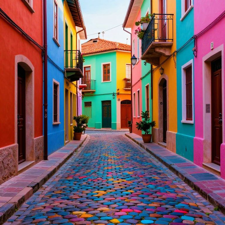 Vibrant hues spill across the cobblestone street like liquid dreams, transforming an ordinary alley into a kaleidoscopic canvas where reality dissolves into a surreal tapestry of color and light.