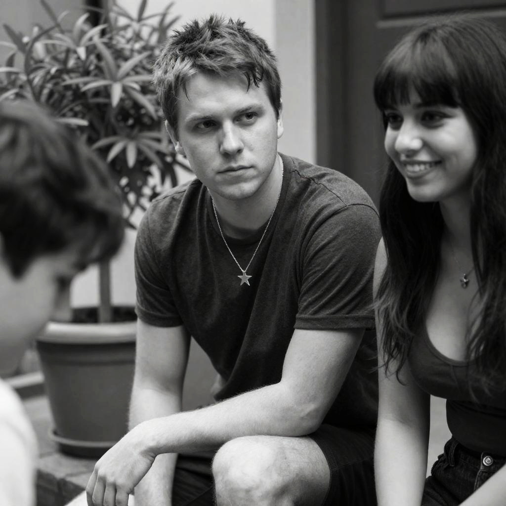 Black and white photo of a young man and woman sitting side by side on a wooden bench outdoors. The man with short curly hair is wearing a dark t-shirt and pants, looking attentively at the woman. The woman with a headband and wearing a patterned sleeveless dress looks back calmly. Both have relaxed seated postures with a blurred natural background.
