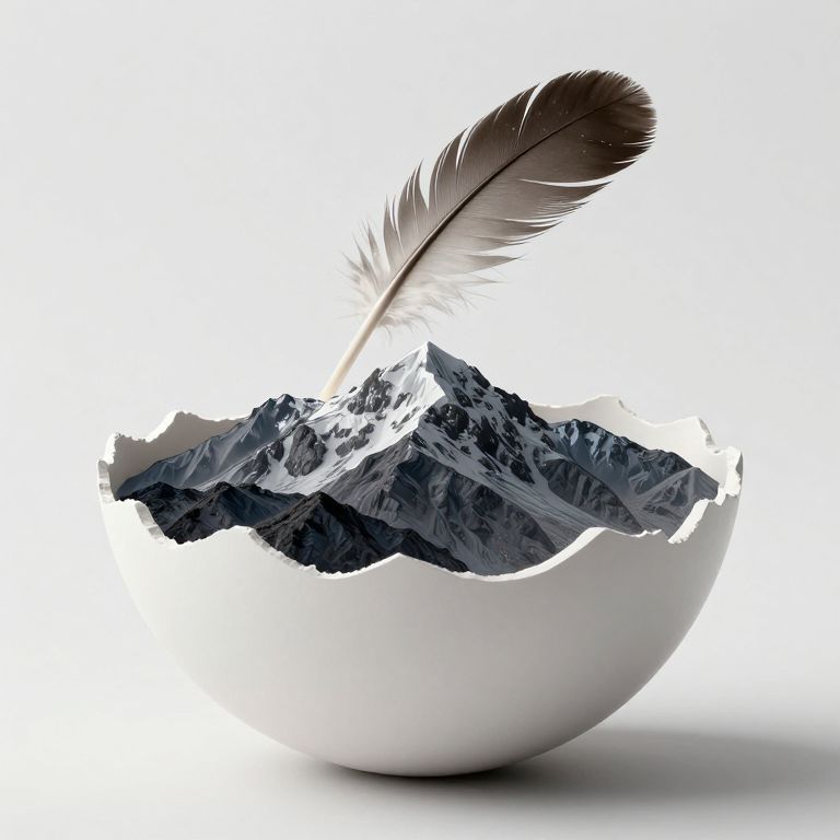 Digital artwork depicting a broken white eggshell with jagged edges, revealing a realistic, textured mountain peak inside. Emerging from the top of the mountain is a single brown and white feather. The background is stark white, emphasizing the contrast between the smooth, white eggshell and the rugged, dark gray mountain. The feather is positioned diagonally, adding a dynamic element to the composition. The image blends realism with surrealism, creating a striking visual metaphor.