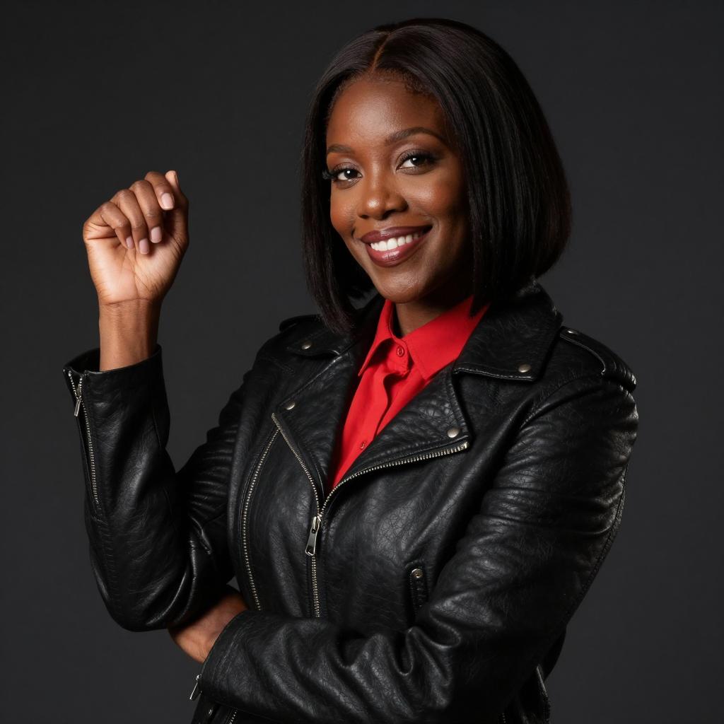 Close-up photograph of an African-American woman with medium brown skin, long wavy brown hair, wearing a red and orange striped scarf, white shirt, and small gold earrings. She has dark red lipstick and a serious expression. Background is blurred with red and green hues.