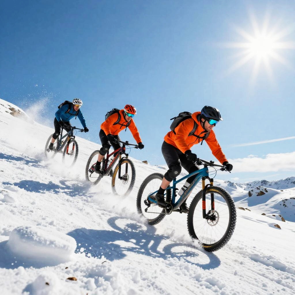 Photograph of three mountain bikers racing down a snowy slope, captured from a low angle. They're wearing bright orange jackets, helmets, and goggles, with their bikes kicking up a spray of white snow. The background is a vivid blue sky with the sun shining brightly. The bikers are positioned in a diagonal line, creating a dynamic sense of speed and motion.