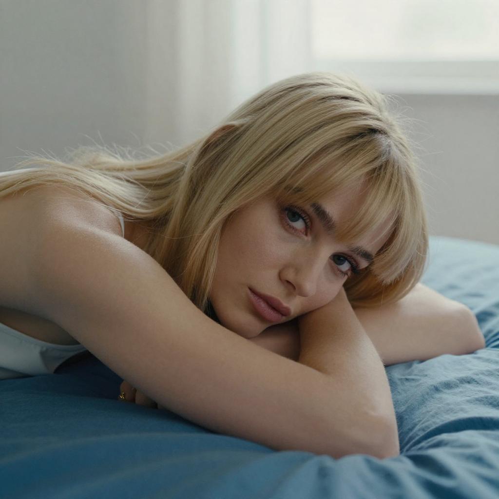 Photograph of a blonde woman with straight hair and bangs, lying on a blue bed, head resting on her arm, gazing at the camera with a pensive expression. She wears a gold ring on her right hand. Background is softly blurred with a bright window.