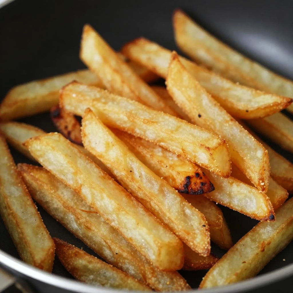 This close-up photo shows a pile of golden-brown, slightly charred French fries in a black frying pan. The fries have a crispy texture with some dark spots indicating they're well-cooked. The bright, warm colors of the fries contrast with the dark pan, making them stand out. The lighting highlights the fries' texture and color, giving them a appetizing appearance.