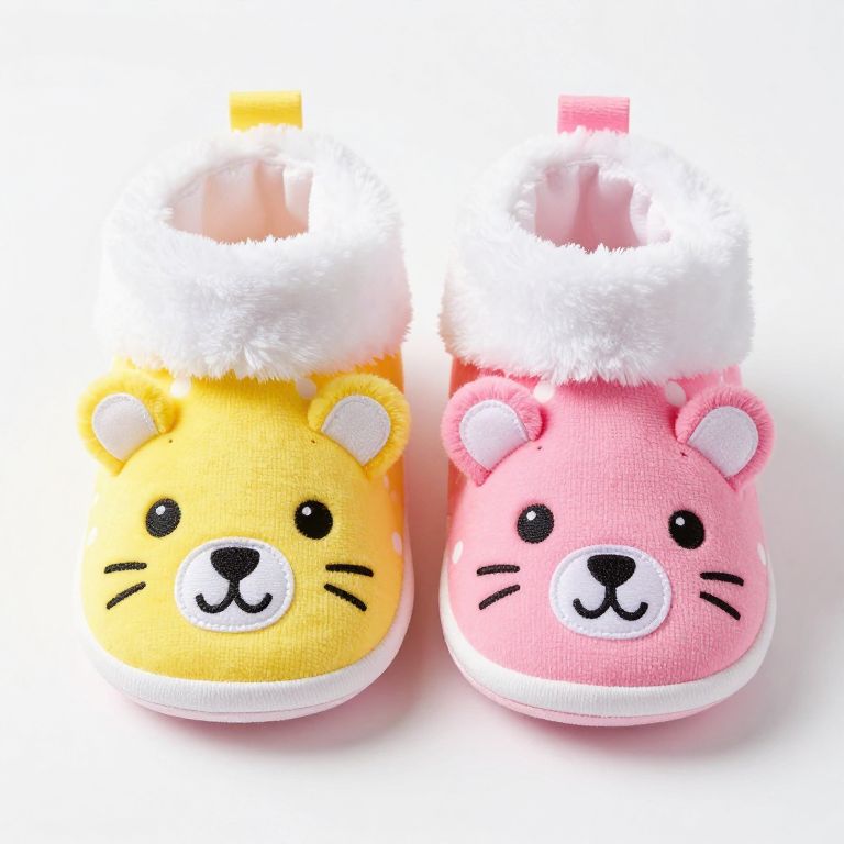 Two adorable baby booties featuring cartoon animal faces rest side by side, showcasing vibrant yellow and pink colors with polka dots and plush white cuffs, designed for comfort and anti-slip functionality.