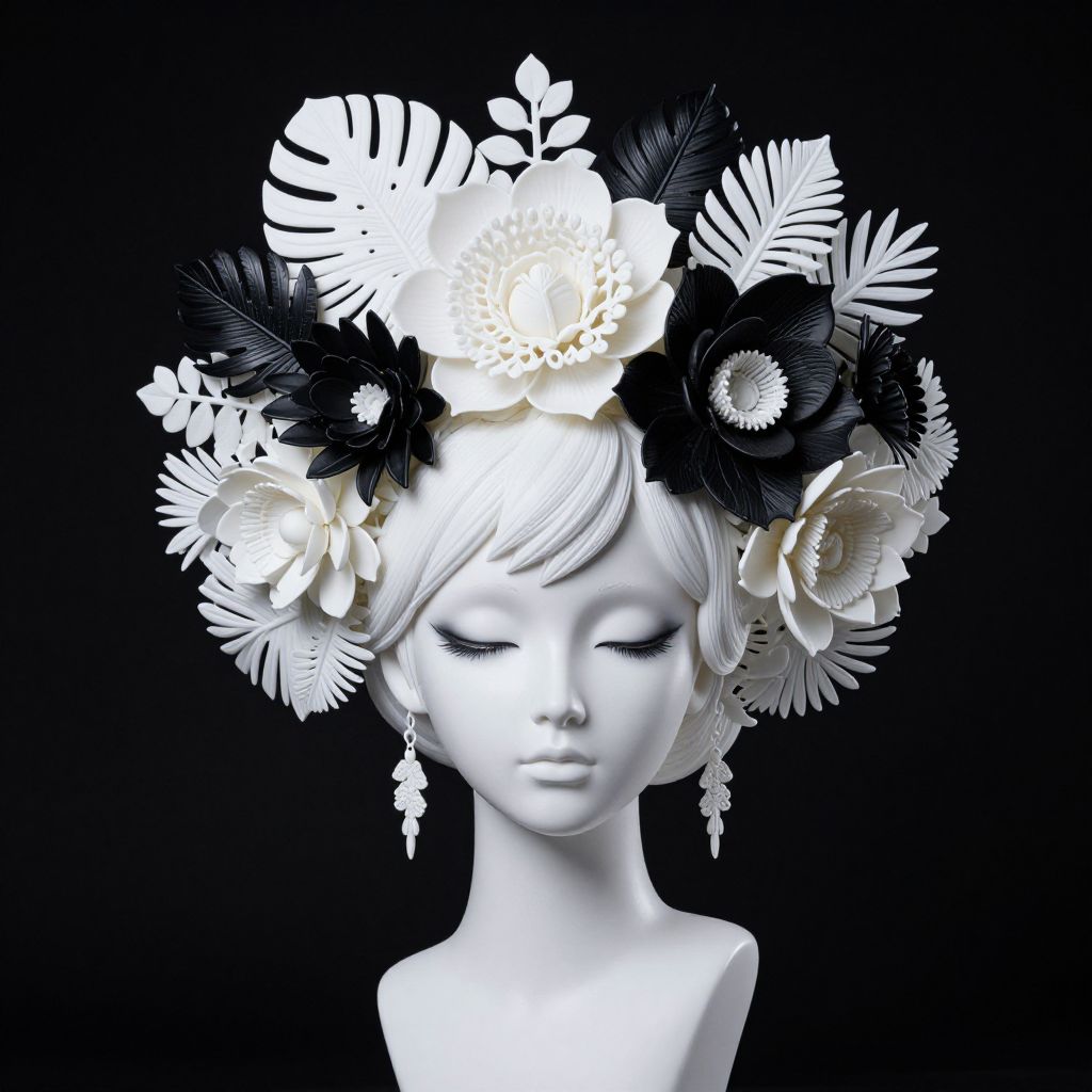 The image showcases a stunning, lifelike white porcelain android model with intricate white and black makeup and hair. The android's head is adorned with an enormous, gigantic headpiece composed of white and black tropical plastic flowers, creating a dramatic and creative visual effect. The headpiece is composed of various types of flowers, including large, delicate petals and intricate, layered blooms, all arranged in a symmetrical and balanced manner. The android's hair is styled in a similar fashion, with white and black flowers intertwined, adding to the overall elegance and sophistication of the model. The background is a stark black studio setting, which contrasts sharply with the white porcelain, emphasizing the model's details and the intricate headpiece. The lighting is rim lighting, highlighting the edges of the flowers and creating a dramatic, three-dimensional effect. The overall composition is balanced and harmonious, with the android's face and headpiece as the focal point, drawing the viewer's attention to the intricate details and craftsmanship of the model.