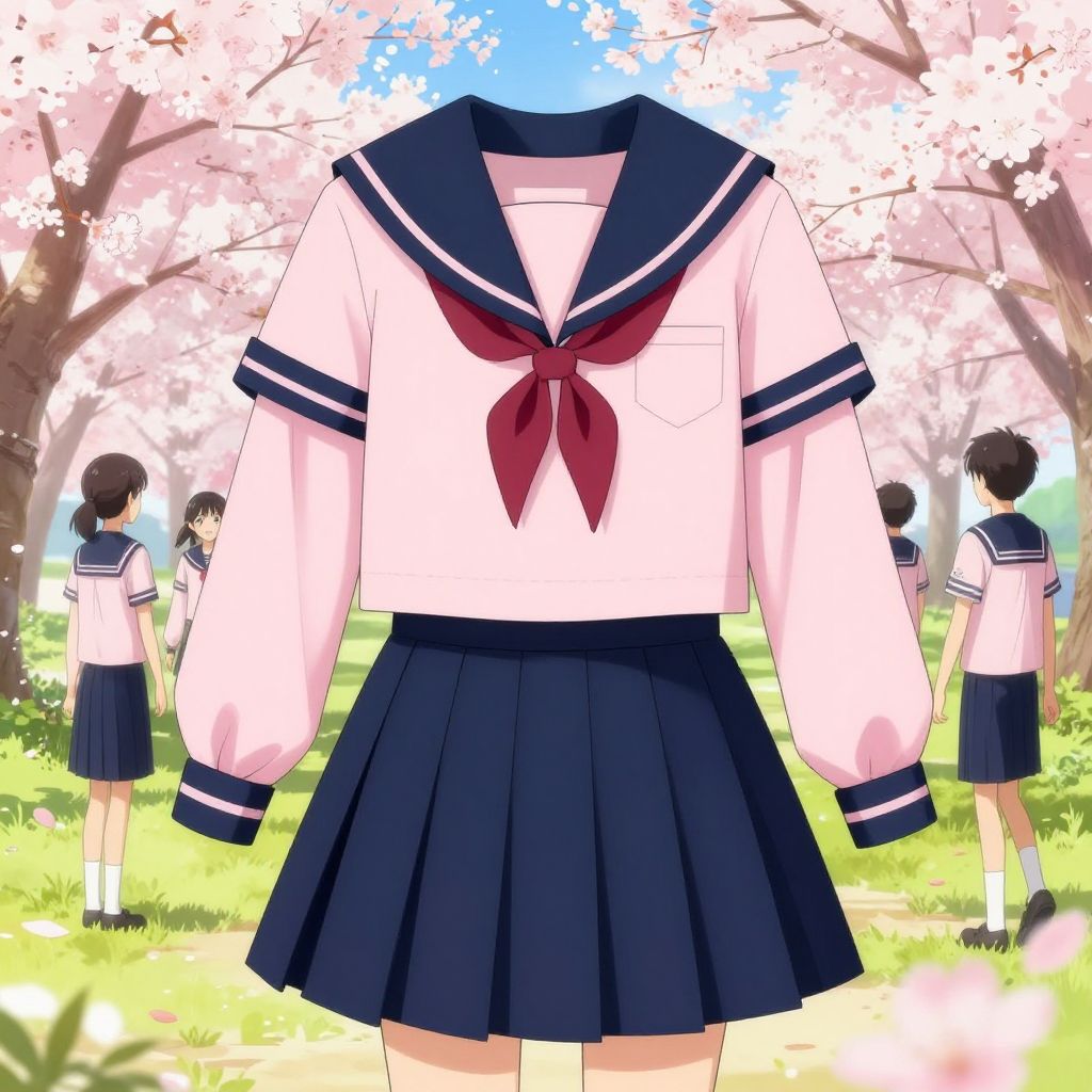 School uniform design inspired by Japanese anime culture, sailor collar style with pastel pink and navy blue tones, ribbon tie and pleated skirt, students in a cherry blossom garden during spring, bright expressive colors, manga art style