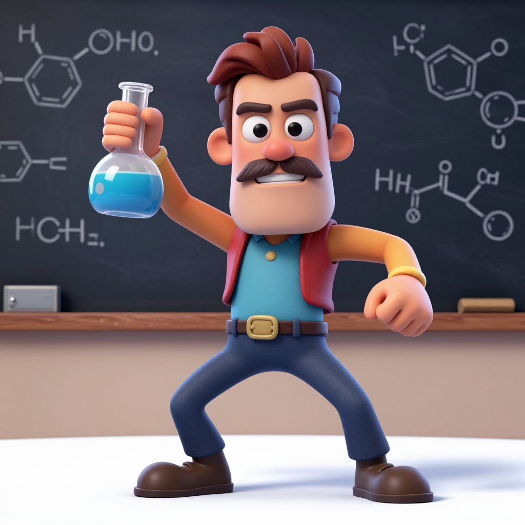 3D cartoon man with red vest, blue shirt, and mustache, holding blue liquid in a flask, stands in front of a chemistry chalkboard