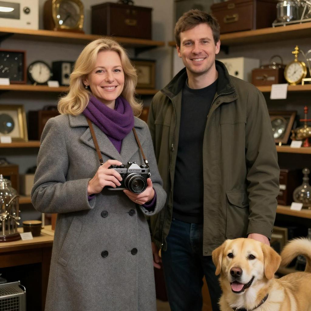 Photograph of a woman and a man in an antique shop. Woman with blonde hair, gray coat, purple scarf, holding a vintage camera, smiling. Man with short brown hair, green jacket, black shirt, smiling, standing next to a yellow dog. Background: shelves with antique items, dimly lit. Woman on left, man on right, dog on right foreground. Woman looking up at camera, man looking at woman.