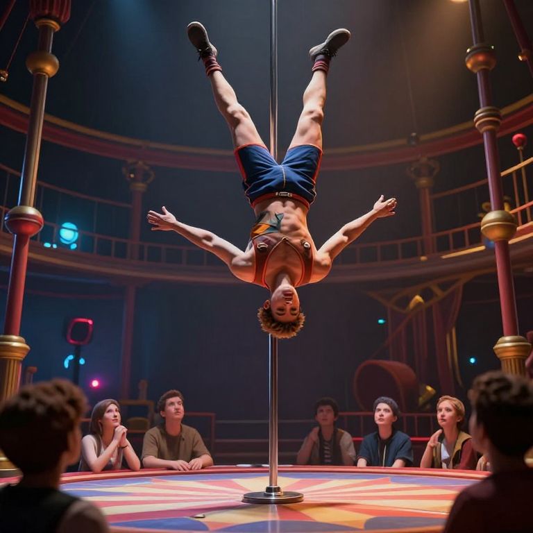 In a mesmerizing 3D-rendered circus scene bathed in dramatic lighting, an acrobat performs a gravity-defying somersault, suspended upside-down on a pole, as the audience watches in awe, blending reality with the surreal in a high-definition, cyberpunk-inspired visual spectacle.