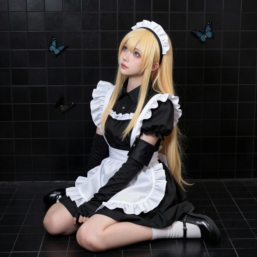 Anime-style digital drawing of a blonde maid with blue eyes, wearing a black and white outfit, sitting and gently holding a glowing blue butterfly.