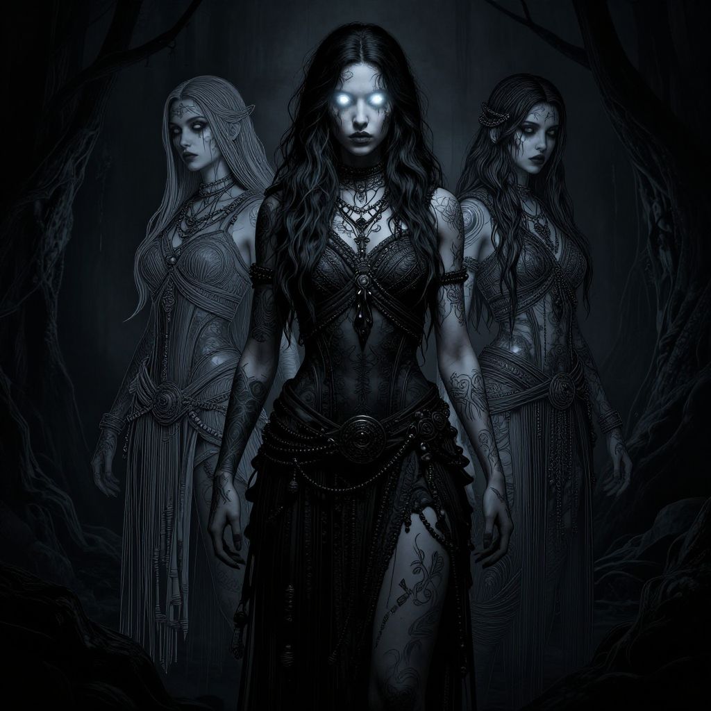 Digital artwork of three ethereal women with glowing white eyes, wearing intricate dark clothing, standing in a shadowy, blue-lit forest.