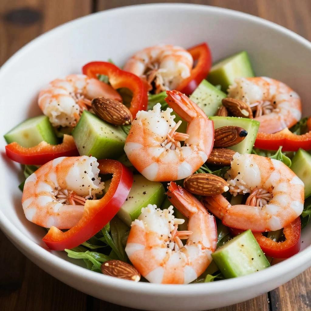 Close-up of a vibrant salad in a white bowl featuring cooked pink shrimp, sliced red bell peppers, green cucumber chunks, and toasted almonds, lightly seasoned with black pepper. The fresh ingredients contrast with the dark wooden surface background, highlighting the colorful and healthy dish.