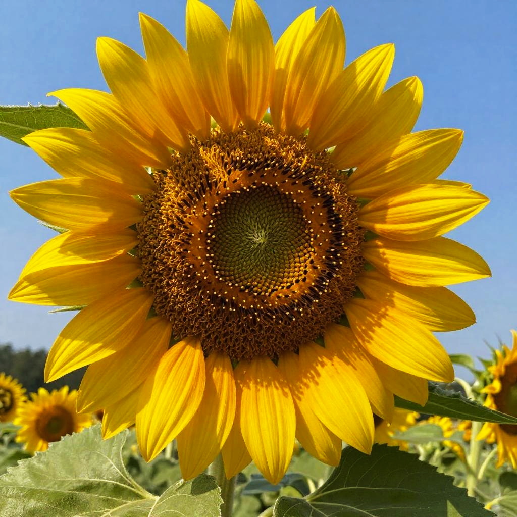 Blonde filter enhancement on a close-up photograph of blooming sunflowers, petals glowing with golden tones, rich green contrasts in the leaves, bright blue sky in the background, vivid sharp details with a warm, inviting atmosphere.