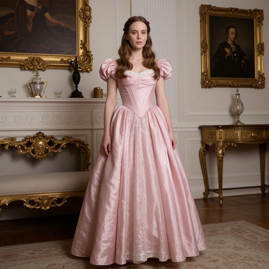Photograph of a fair-skinned woman with long brown hair, wearing a pink satin ball gown, standing in an elegant, classical room with gold-fr