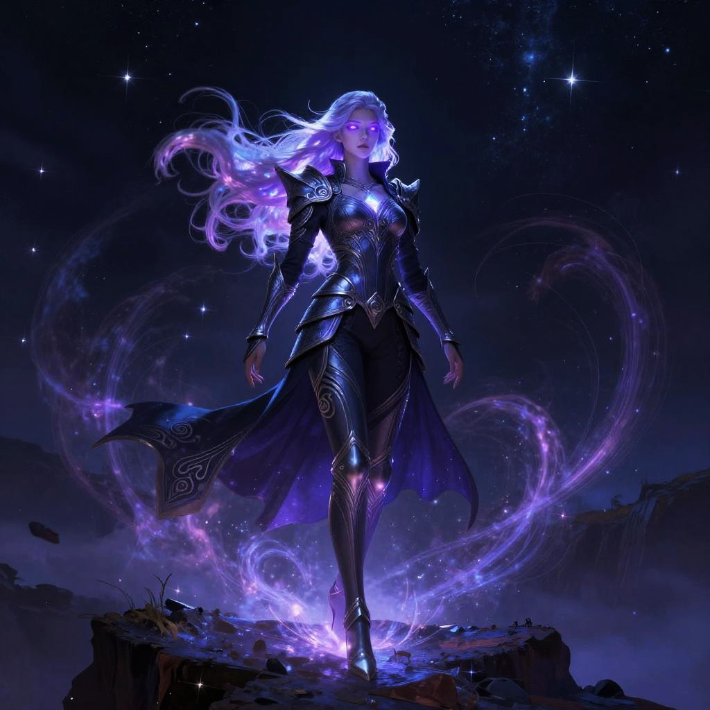 Void elf female standing on a cliff at night, glowing violet eyes and luminescent hair flowing, ethereal dark armor with intricate silver runes, surrounded by swirling cosmic void energy and stars, fantasy art detailed background