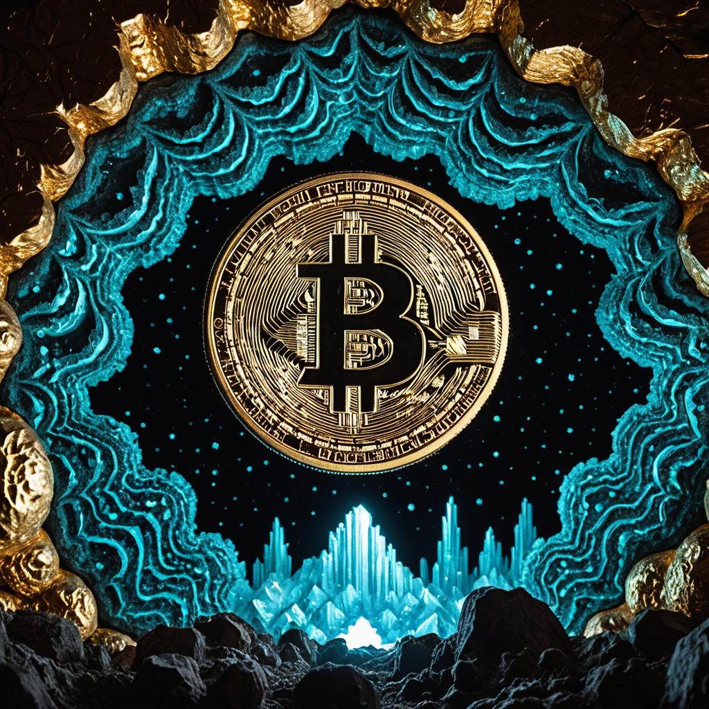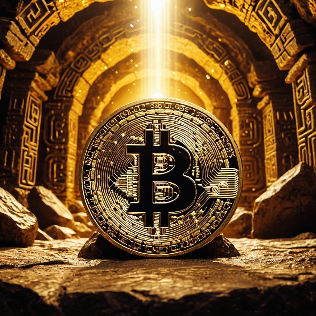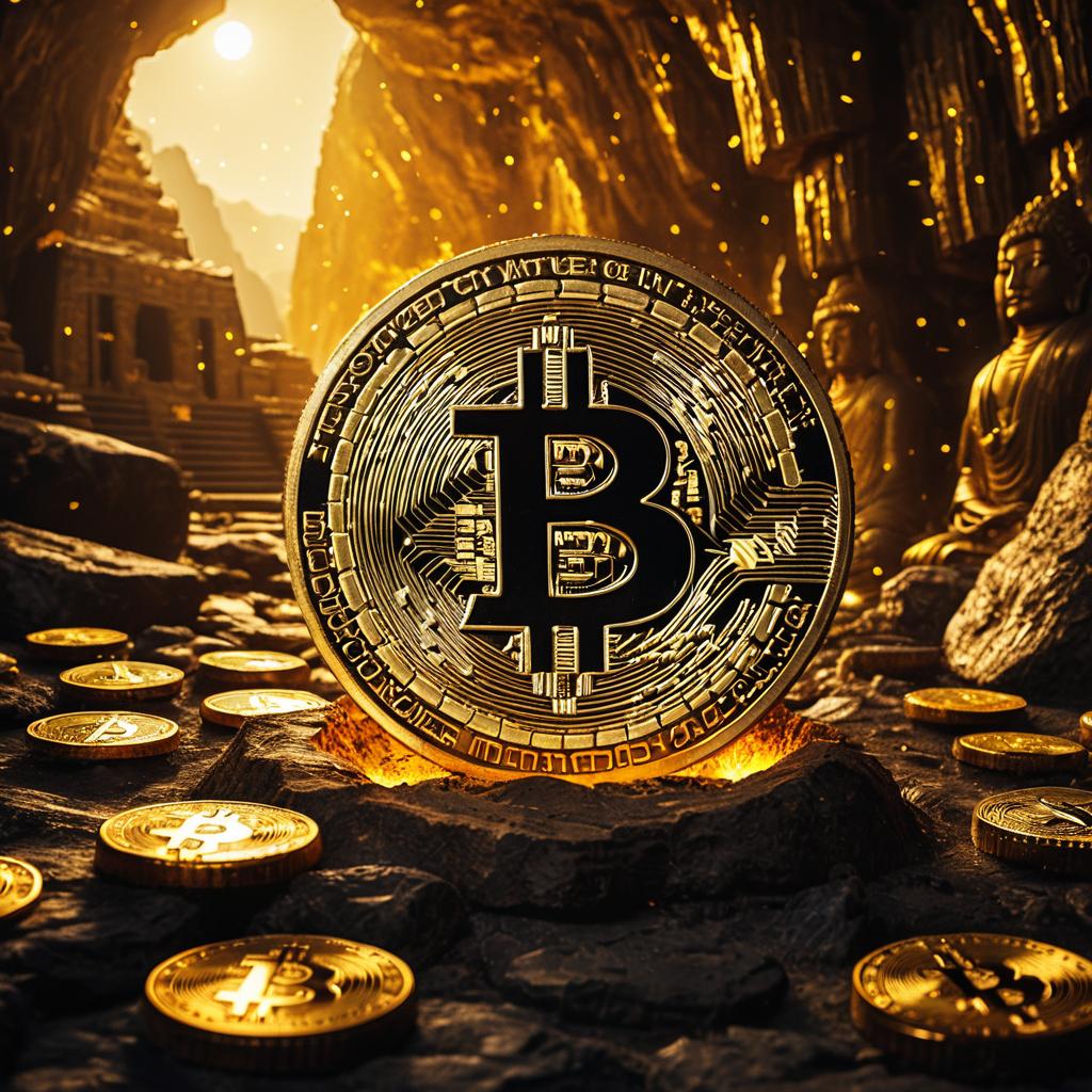 Artwork of bitcoin logo forged from molten gold, a sacred mountain cave temple, surrounded by ancient glyphs emitting golden light, hyper-realistic and dramatic