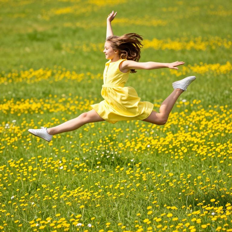 Photograph of a young girl with brown hair, wearing a yellow dress and white sneakers, mid-air leap in a vibrant yellow and green meadow.