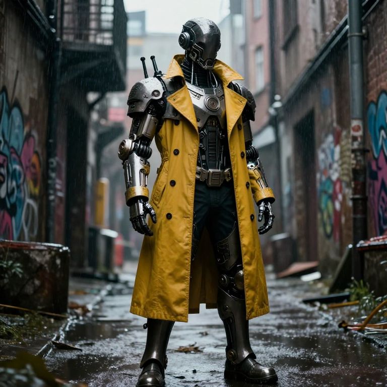 In a dimly lit, rain-soaked alley, a figure stands poised and ready, exuding a sense of readiness and resilience. The individual is clad in a detailed, futuristic armor that blends seamlessly with the urban decay around them. The armor, intricately designed with mechanical components and a mix of metallic and organic textures, covers their body from head to toe, creating a striking contrast against the soft, diffused light. The figure's attire is a blend of practicality and style, with a yellow trench coat that adds a splash of color to the otherwise muted palette of the scene. The coat is adorned with various mechanical and cybernetic enhancements, each contributing to the overall aesthetic of the character. The background, a labyrinth of graffiti-covered walls and dilapidated structures, enhances the atmosphere of a post-apocalyptic or dystopian world. The rain, visible as a soft mist, adds a layer of moisture to the scene, highlighting the textures and details of the armor and the figure's clothing. The overall composition, with the figure centrally positioned and the alley stretching out behind them, draws the viewer's eye into the depths of the scene, creating a sense of depth and intrigue. The interplay of light and shadow, combined with the intricate details of the armor and the surrounding environment, gives the image a cinematic quality, reminiscent of the works of Alphonse Mucha, with a nod to the styles of atompunk, dieselpunk, and cyberpunk.