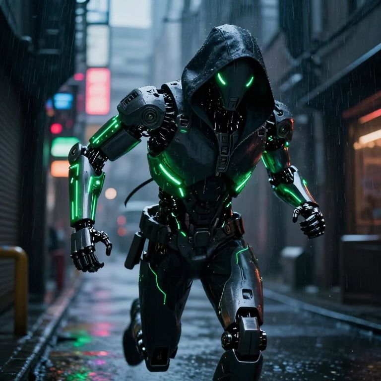 Futuristic Warrior in Rainy Alley