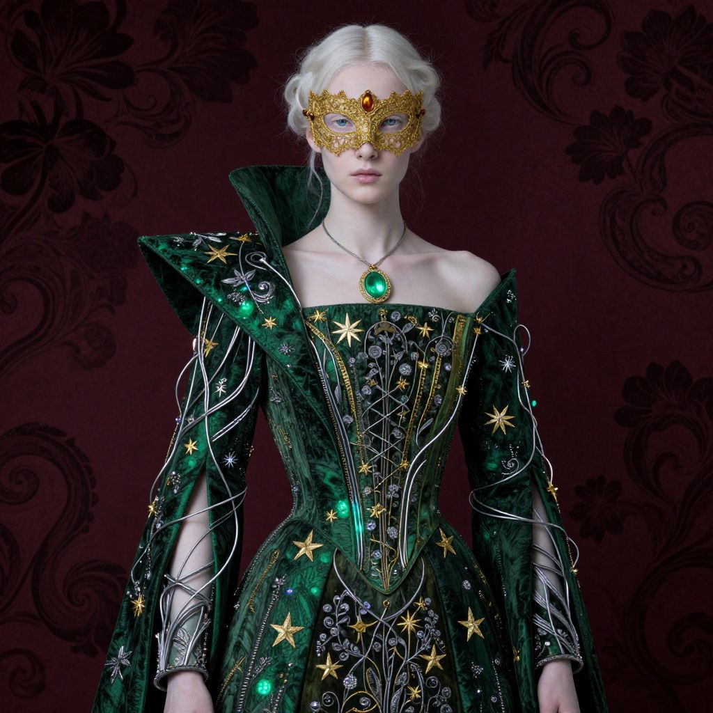 A surrealistic neo-gothic illustration inspired by Gustav Klimt, featuring a young albino woman dressed in an asymmetrical, avant-garde Renaissance-style garment, Her attire combines bold shapes with intricate detail: a high, off-centered collar rises on one side, while an angular sleeve cascades down the other arm, both crafted from luxurious, dark green fabric that shimmers with embedded iridescent cables and winding silver wires, These cables and wires thread through her clothing like delicate veins, catching light and adding an otherworldly gleam, Over her eyes, a delicate golden lace mask adorned with ornamental patterns and small onyx gemstones enhances her ethereal aura, Her gown is embroidered with golden stars and silver vines that subtly shift and sparkle, deepening her mysterious presence, A glowing amulet with a polished emerald rests at her collarbone, radiating a soft, green luminescence, The background is a rich, deep burgundy with swirling dark floral motifs, evoking old-world mystery, Lit by soft, ethereal lighting, this 8K rendering captures every luxurious detail of her avant-garde attire, the delicate lace mask, and the mesmerizing glow of her amulet, immersing the viewer in a dreamlike realm