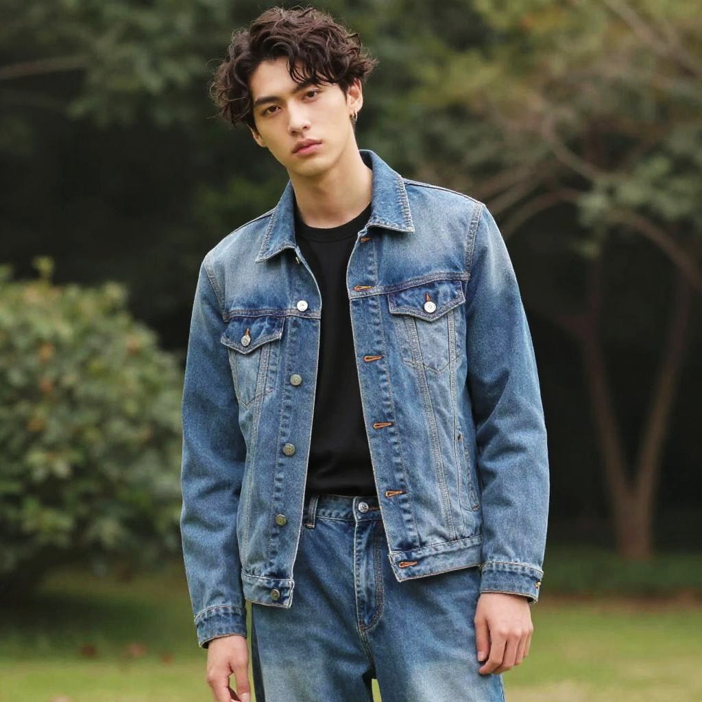 Twist Out hairstyle on male model, wearing denim jacket and pants, in garden, captured in fashion editorial style with soft glow.