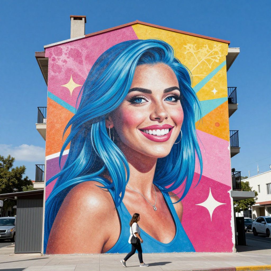 Vibrant mural of a woman with striking blue hair and radiant smile dominates the side of a building, towering over a pedestrian walking below against a backdrop of a clear blue sky and urban surroundings.