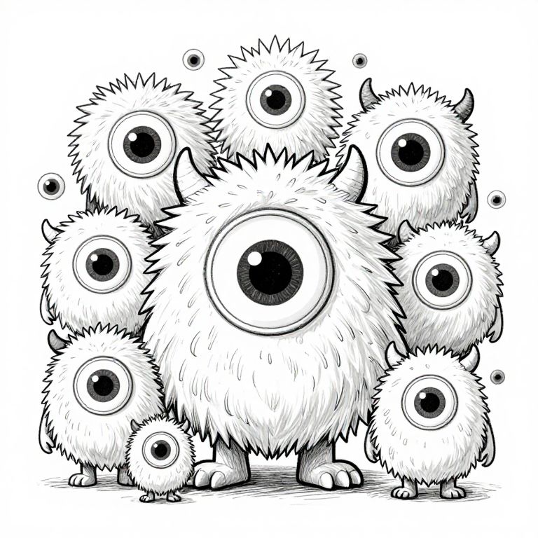 The image is a black and white clipart sketch outline featuring a group of fluffy, many-eyed monsters on a white background. The central monster has a large, round eye surrounded by a circular outline, giving it a prominent and expressive appearance. Surrounding this central figure are numerous smaller monsters, each with multiple eyes of varying sizes and shapes, creating a sense of depth and complexity. The monsters have spiky, fuzzy textures, adding to their playful and whimsical nature. The arrangement of the monsters is somewhat clustered, with some monsters overlapping or near each other, while others are spaced out, creating a dynamic and engaging composition. The overall effect is a charming and imaginative depiction of these fantastical creatures.