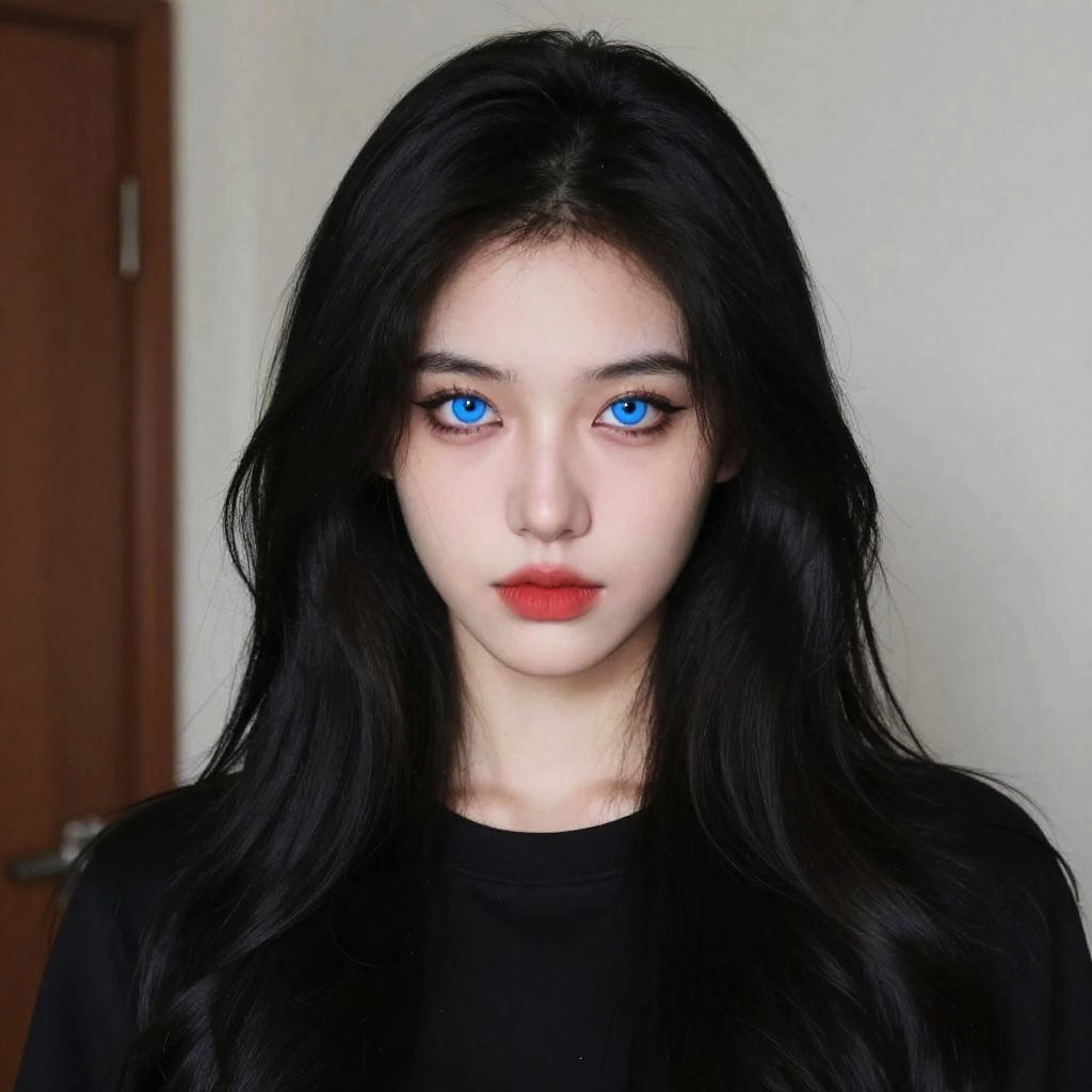 Photograph of an Asian woman with long black hair, striking blue eyes, red lipstick, and pale skin, wearing a black shirt, against a plain
