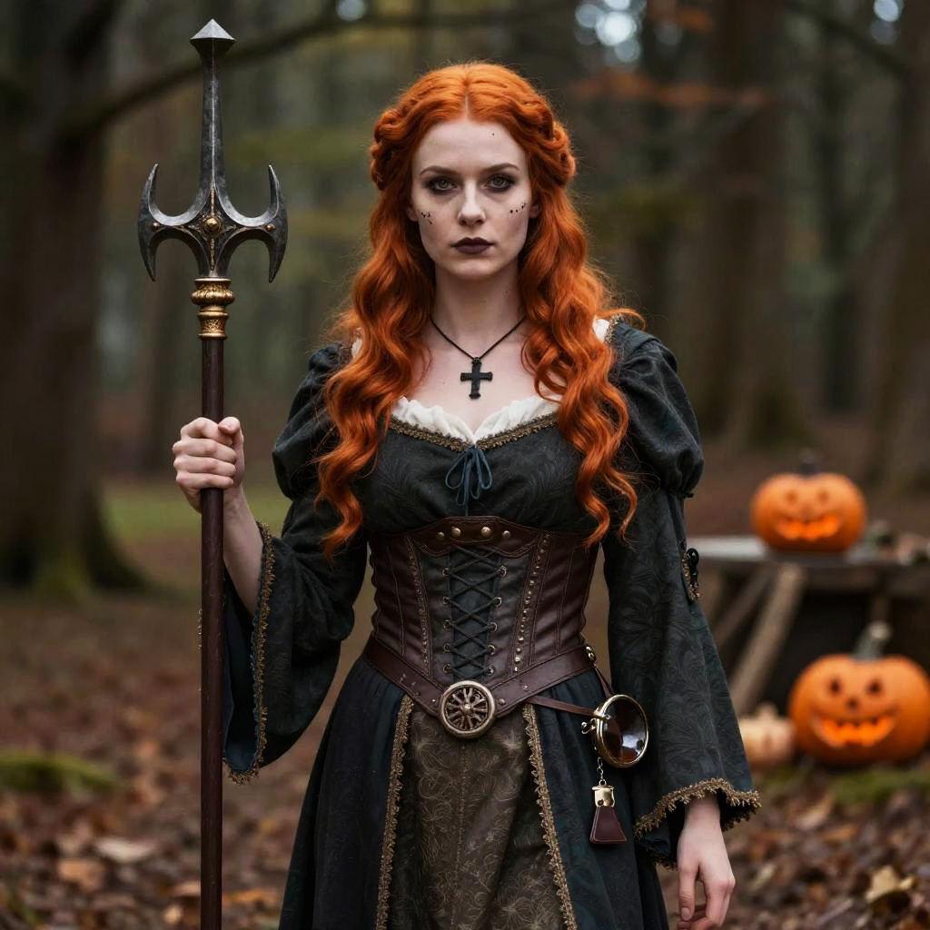 Photograph of a woman with long, wavy blonde hair wearing a red devil costume. She has small, pointed black and white horns on her headband. Her outfit includes a dark red, long-sleeve, gothic-style dress with intricate patterns, a black belt with gold buckles, and black boots. She stands confidently in the center of a gray, stone-paved area with a blurred urban background.