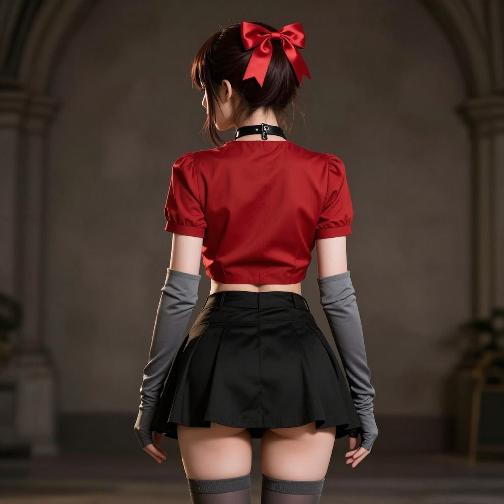 Score_9, score_8_up, score_8, cinematic lighting, g0thicPXL, vaggie, red shirt, short sleeves, collared shirt, black choker, midriff, black skirt, grey elbow gloves, fingerless gloves, grey thighhighs, red hair bow, red hair ribbon, showing back, upskirt, sensual
