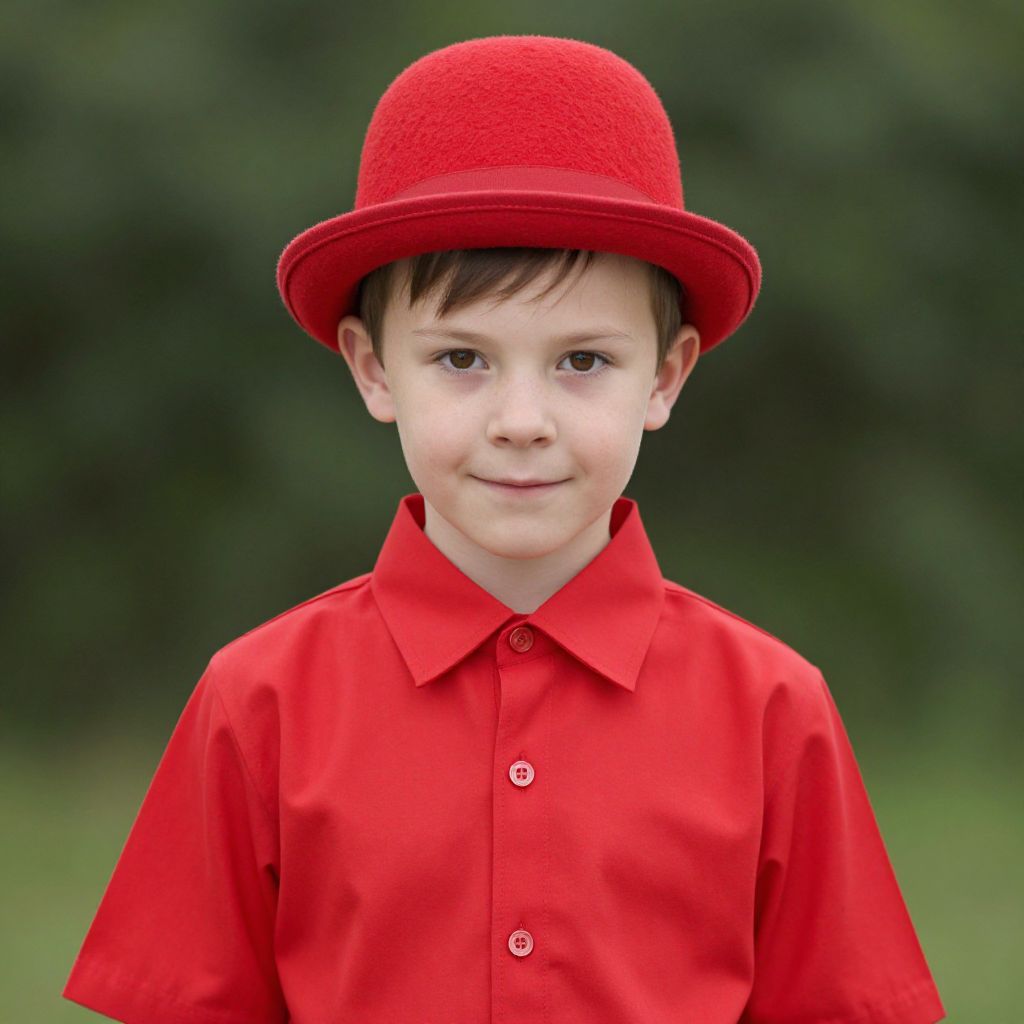 Photograph of a young boy with fair skin and brown eyes, wearing a bright red, textured bowler hat and a matching red button-up shirt. His short brown hair peeks out from under the hat. He stands against a blurred green background, likely outdoors. The boy's expression is neutral, with a slight smile. The vivid red of his attire contrasts sharply with the green backdrop, drawing attention to his outfit. The image has a sharp focus on the boy, with the background softly out of focus, emphasizing him as the subject.
