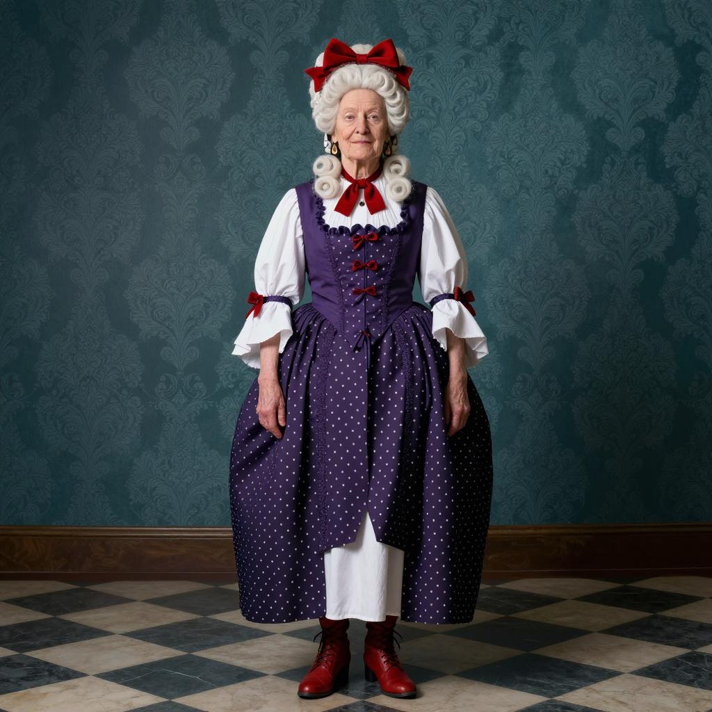 Portrait of an elderly white woman wearing an elaborate 18th century vintage-style costume. She has a large white wig adorned with a red bow and is dressed in a purple bodice with red bows, white puffed sleeves, and a dark purple skirt with white polka dots. She wears red laced boots and stands on a checkered floor against a teal patterned wallpaper background with studio lighting. The image is detailed and realistic, capturing historical fashion with a slight smile on her face.