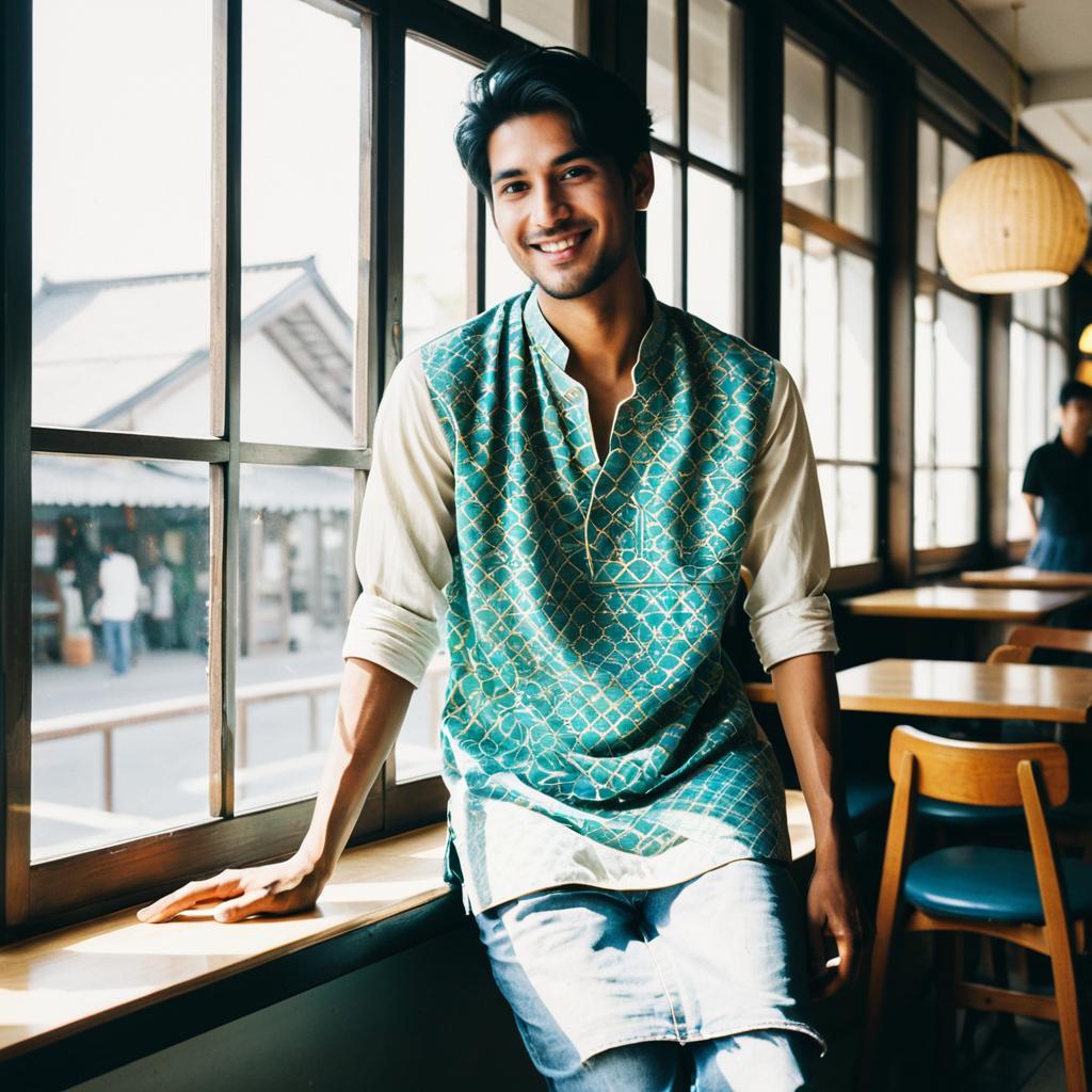Ink Pigment Full body, in a white cafe, the sun shines in through the window. Real shot of a beautiful Indian male model with a slanted face. He is 22 years old with fair skin. The head of a Japanese-style princess is wearing a bright-colored kurta. He has a beautiful slim waist and short jeans. Dynamic movements block the light with his hands. Light and shadow half-body proportion smiling love feeling 8k Japanese tone photo.