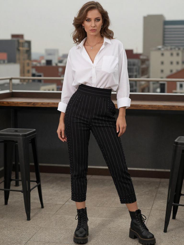 A woman, in a hand-tinted photograph style, wearing a relaxed white button-up shirt and black high-waisted pants with vertical stripes and polka dots, cropped at the ankle, chunky black lace-up boots, one hand in pocket, posed at a city rooftop bar. Sexy. Pretty face and beаutiful eyes. Big breasts