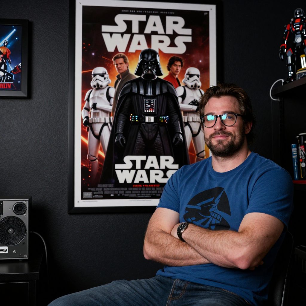 A photograph of a bearded, glasses-wearing man with light skin and brown hair, wearing a blue T-shirt with a Star Wars logo, sitting with arms crossed. Behind him is a large poster of "Star Wars" featuring Darth Vader and Stormtroopers. The poster is brightly lit, contrasting with the dark wall. To the left, a smaller framed poster is partially visible, and to the right, a shelf with a Star Wars figure and speaker are seen. The setting is a dimly lit room with a modern, geeky aesthetic.