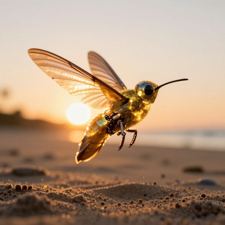 Glowing mechanical hummingbird perched on sandy terrain, its crystalline wings shimmering with golden light as the setting sun casts a warm, radiant glow behind it.