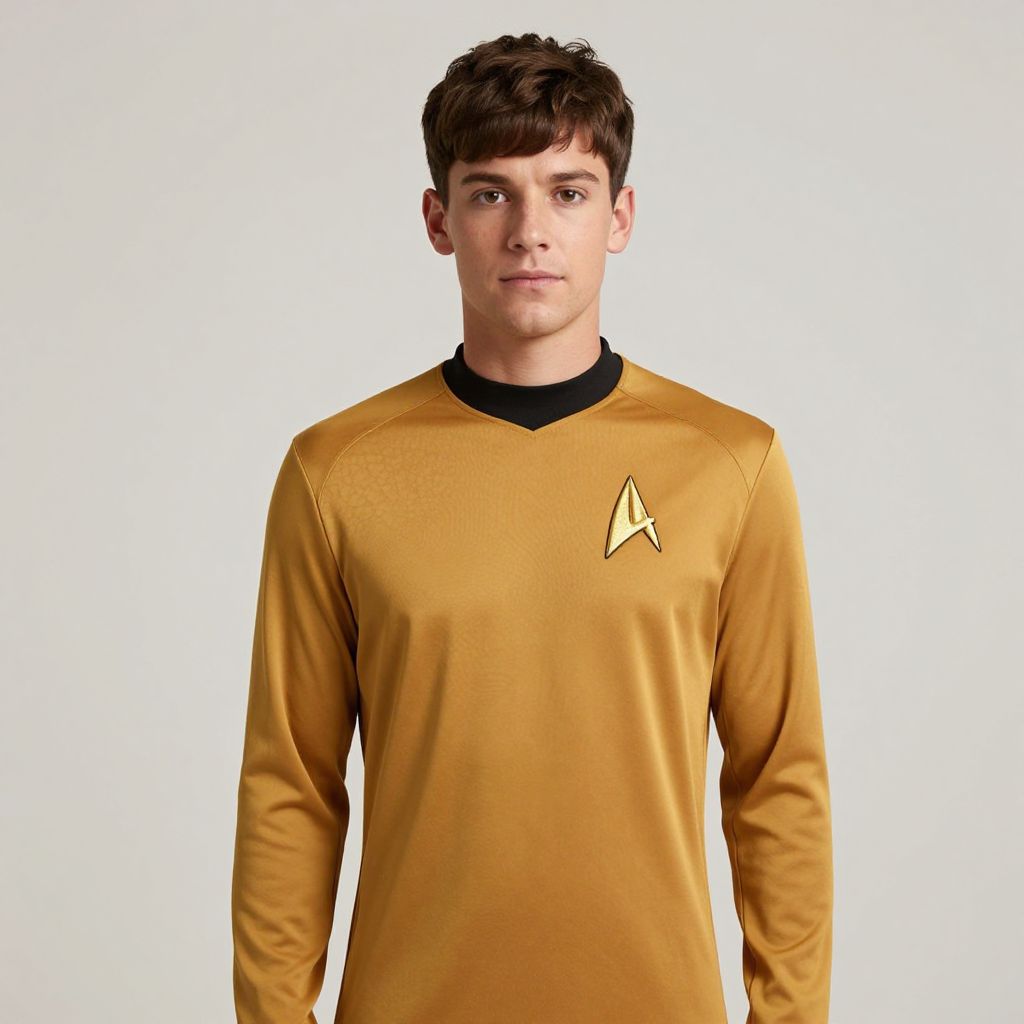 Star trek suit costume, 1boy, male focus, solo, realistic, sportswear, soccer uniform, looking at viewer, upper body