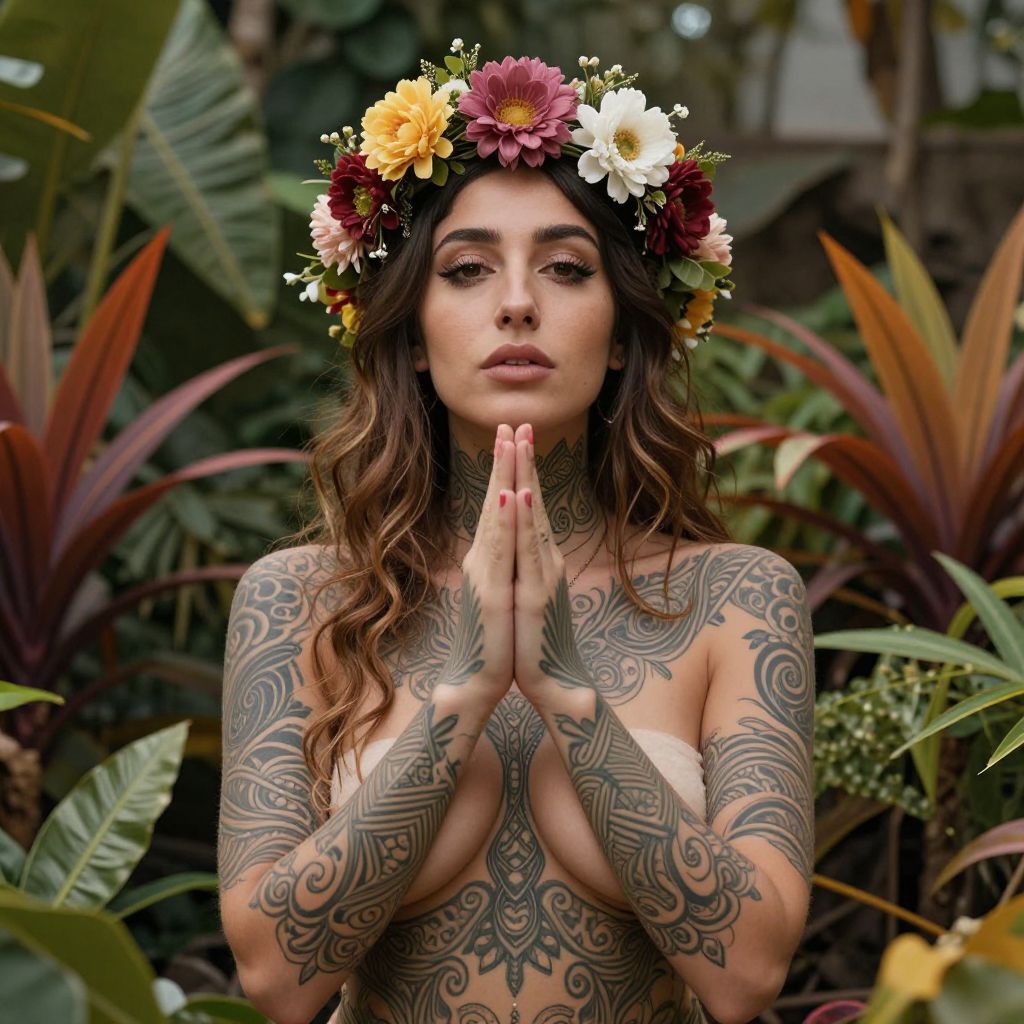 Tattooed woman with long brown hair, wearing a floral crown, praying with hands together, surrounded by lush greenery and colorful flowers. Phot