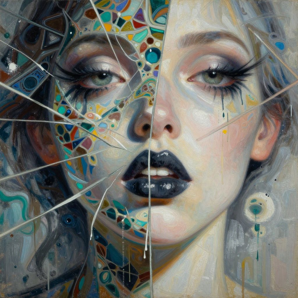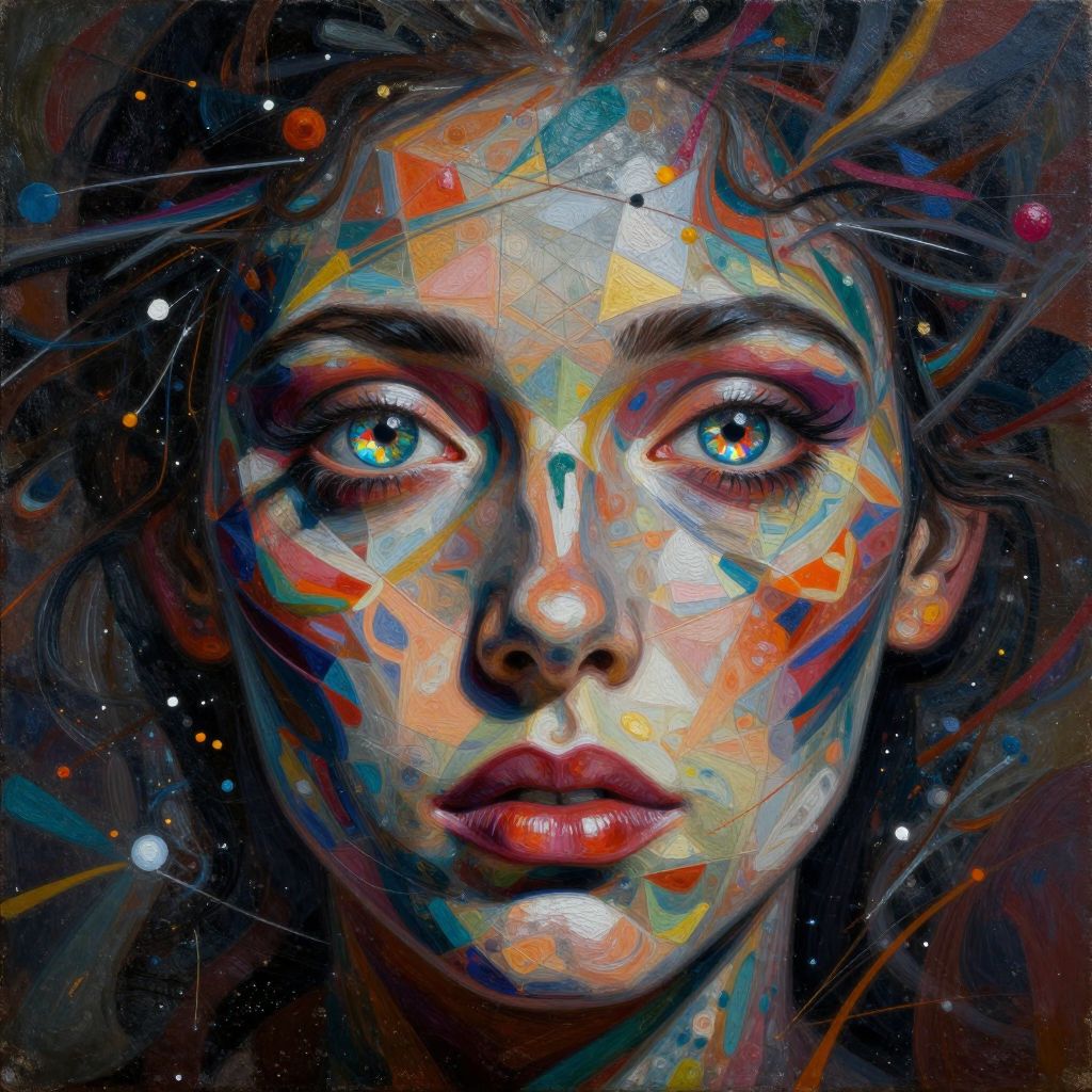 Envision an enigmatic portrait that merges surrealism with vivid color, reminiscent of a dreamlike state. Half of the woman's face is bathed in vibrant blues and swirling textures, creating an illusionary effect akin to viewing through a kaleidoscope. The contrasting hues evoke mystery and emotional depth, while the 'bug's-eye view' perspective emphasizes intricate brushstrokes and striking contrast between the vivid blue and its surroundings, resulting in an extraordinary fusion of art styles that captivates the viewer with its dreamlike wonder.