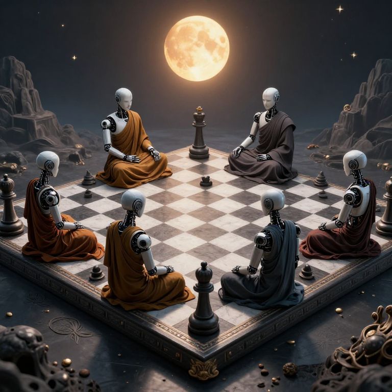 Robotic monks meditate silently atop a giant, tormented chessboard, moving only when celestial alignments dictate new moves between solar wars.