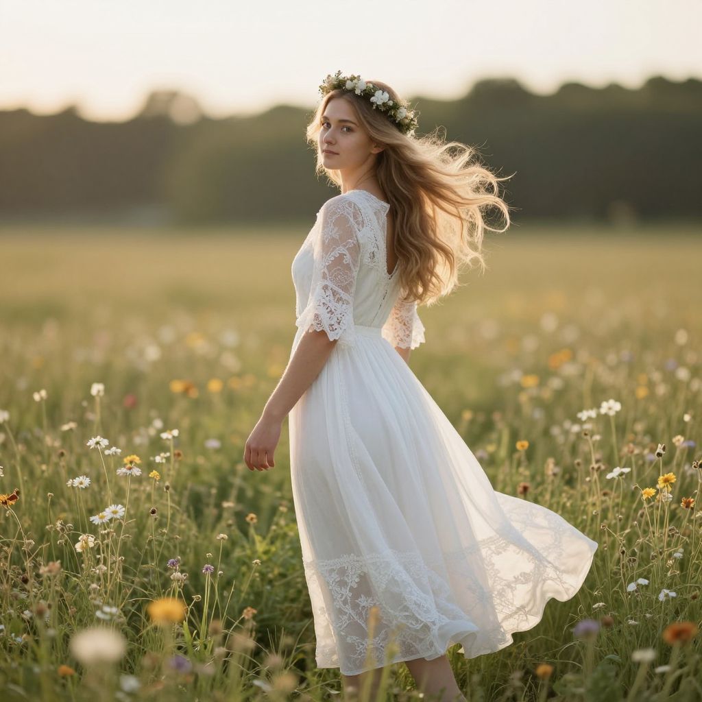 Ethereal sunlight bathes a serene meadow as a gracefully poised young woman stands amidst wildflowers, her flowing blonde hair adorned with a delicate floral crown and her back turned to reveal a lace-trimmed white dress that billows gently in the soft evening breeze.