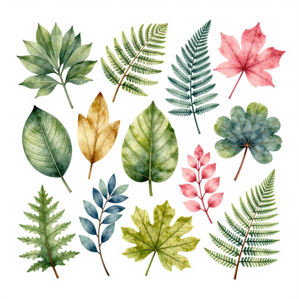 The image presents a beautifully arranged botanical illustration on a white background. The composition features a variety of plant elements, including leaves, ferns, and other foliage, each rendered with intricate detail and vibrant colors. The leaves exhibit a range of shapes and textures, from broad, glossy green leaves to delicate, feathery fern fronds. The colors vary from cool greens and blues to warm pinks and yellows, creating a harmonious yet diverse palette. The plants are arranged in a loose, naturalistic manner, with some elements appearing to overlap or intertwine, while others stand out prominently. The overall arrangement is balanced and aesthetically pleasing, with the plants distributed evenly across the frame, creating a sense of depth and dimension. The illustration style is clean and detailed, capturing the essence of each plant with precision and elegance.