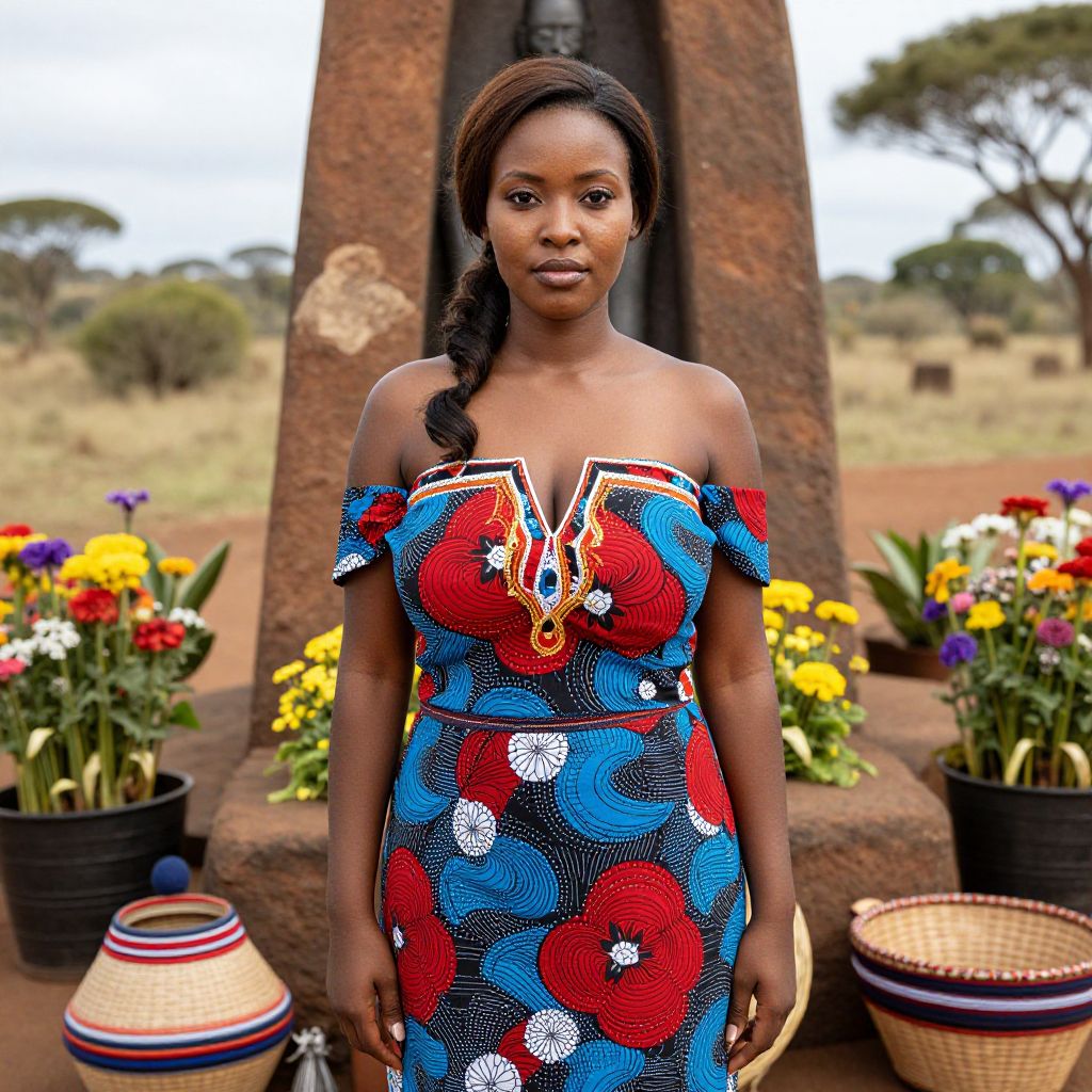 Photograph of a Black woman with dark skin and long, wavy black hair standing outdoors in front of a rustic, tall, brown stone structure. She wears an off-shoulder, vibrant dress with a blue, red, and white floral pattern, featuring a V-neck with colorful beads. Her expression is calm and confident. Surrounding her are colorful flower pots with yellow, red, and white flowers, and two woven baskets with multicolored stripes. The background shows a blurry, dry, savanna landscape with trees and distant hills. The overall setting is bright and natural.