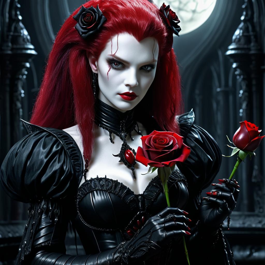 A highly detailed dark fantasy portrait of a pale vampire woman with striking crimson hair and intense gaze, dressed in elaborate black leather gothic attire with puffed sleeves. She holds two blood-red roses, complementing her dark and mysterious aura. Background features a shadowy gothic cathedral interior, amplifying the eerie and fantastical mood.